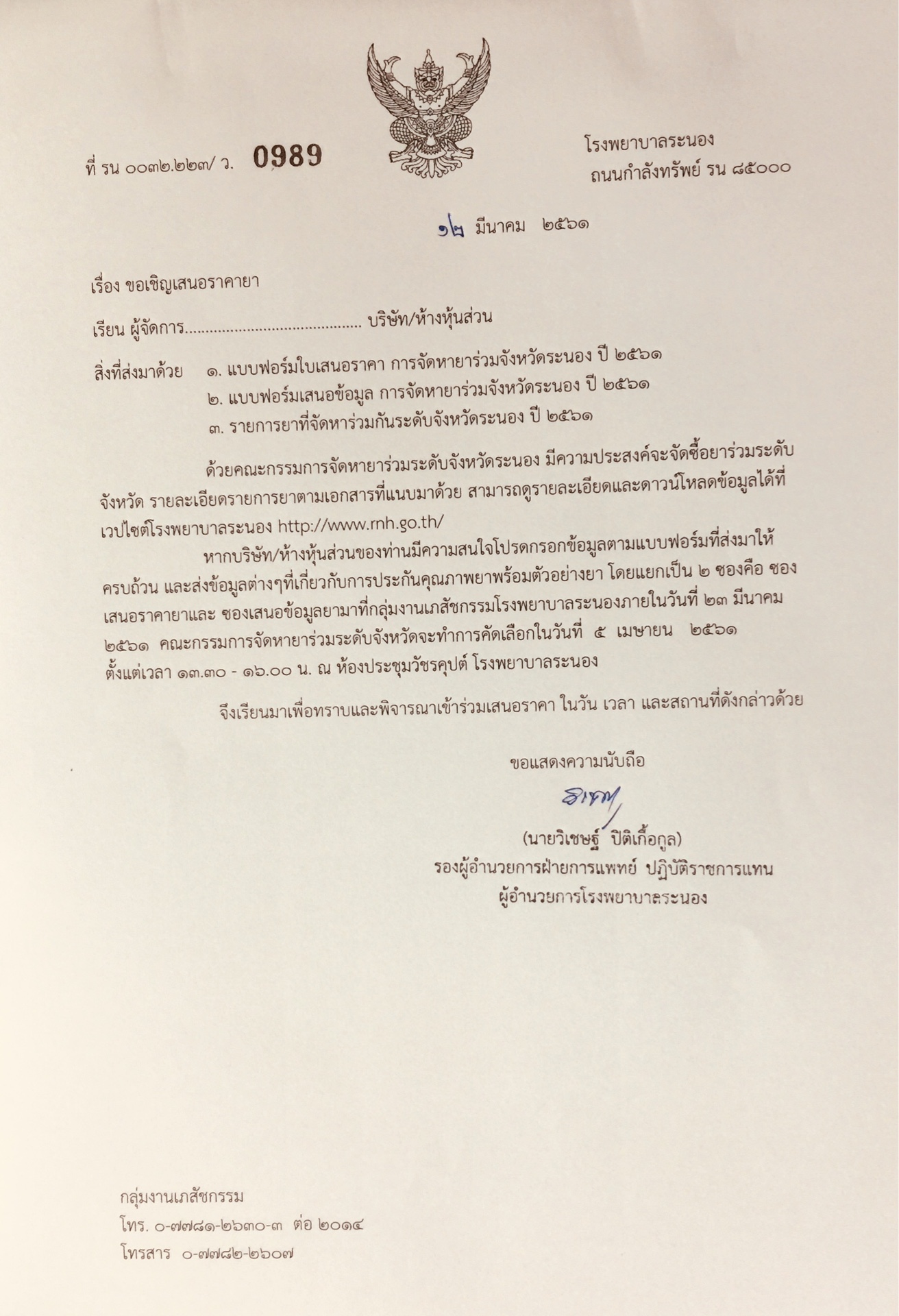 13 มีนาคม 2561 จัดซื้อยาร่วมระดับจังหวัดปีงบประมาณ2561 รายละเอียดการจัดซื้อยาร่วมระดับจังหวัด สามารถดาวโหลดดูข้อมูลได้ เอกสารแนบ เซิญเสนอราคา.jpg เอกสารประกอบการเสนอราคา.rar